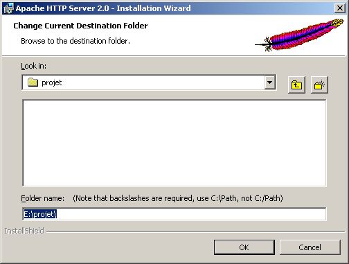 Ici, Apache sera installé dans le répertoire « E:projet ». On clique sur le bouton OK pour valider puis sur le bouton Next pour continuer notre installation.